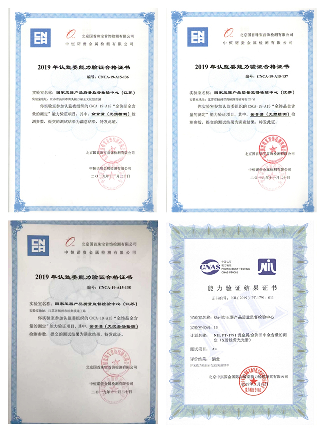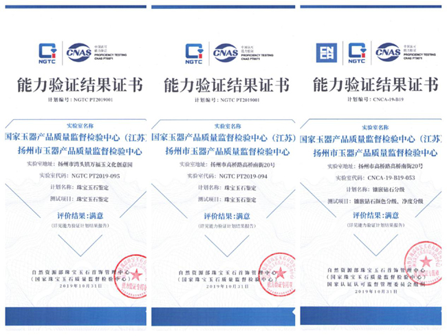 近日,我中心收到了来自国家认监委组织的实验室能力验证计划“镶嵌钻石分级”、“金饰品金含量的测定”项目,国家珠宝玉石质量监督检验中心组织的实验室能力验证计划“珠宝玉石鉴定”项目,以及由北京中实国金国际实验室能力验证研究有限公司组织的实验室能力验证计划“贵金属/金饰品中金含量的测定”项目的能力验证“满意”结果证书,至此,玉器中心实验室参加的2019年度七项实验室能力验证项目全部顺利通过。